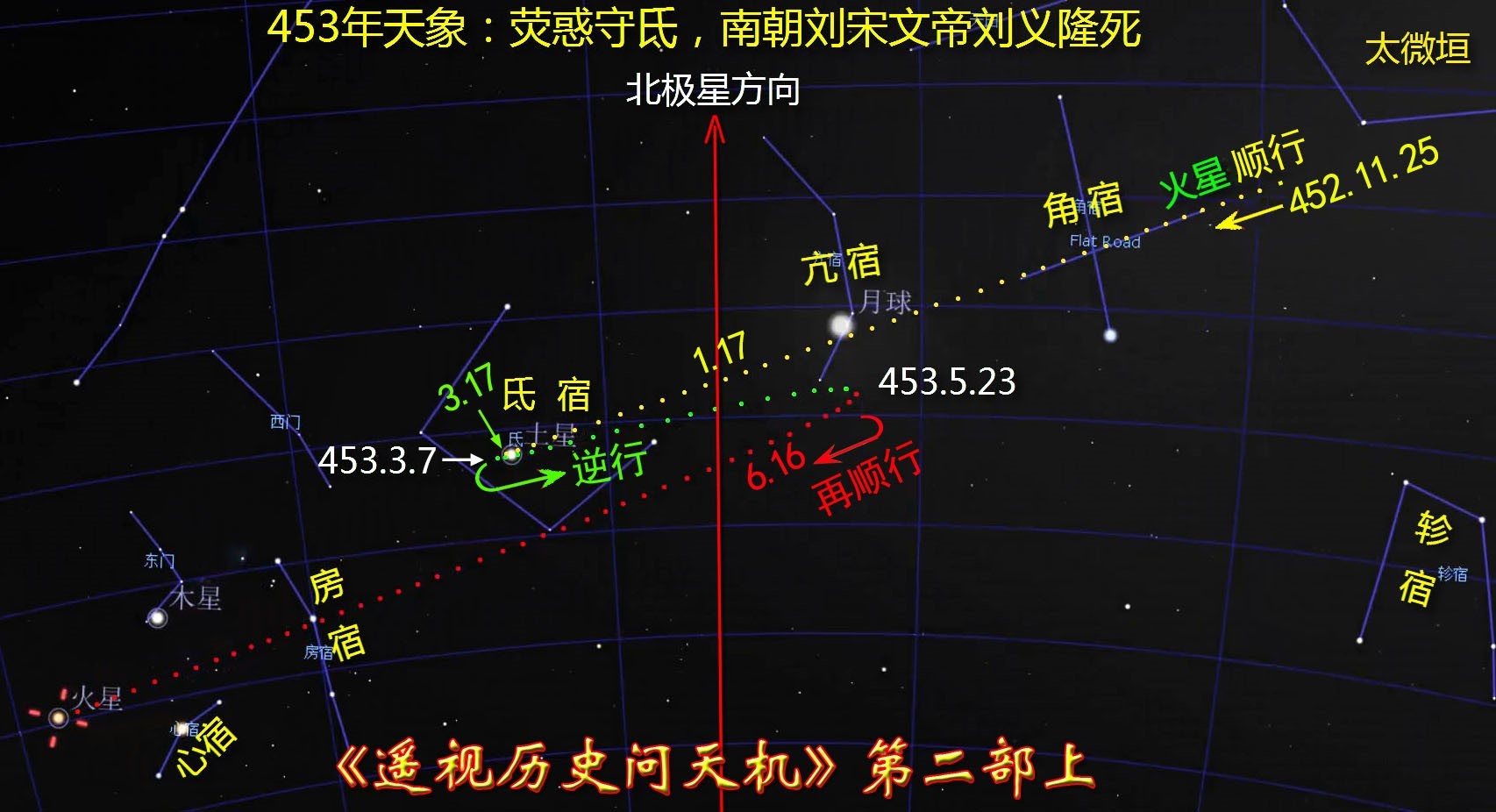 對照上面的天象圖可以看到:453年3月7日,是火星進入氐宿的最深的時刻,在此時停留轉向,3月16日是肉眼可辨的火星緩慢逆行的開始——當日夜裏,太史令向文帝報警,文帝不聽,劉劭就在同時布置著政變。