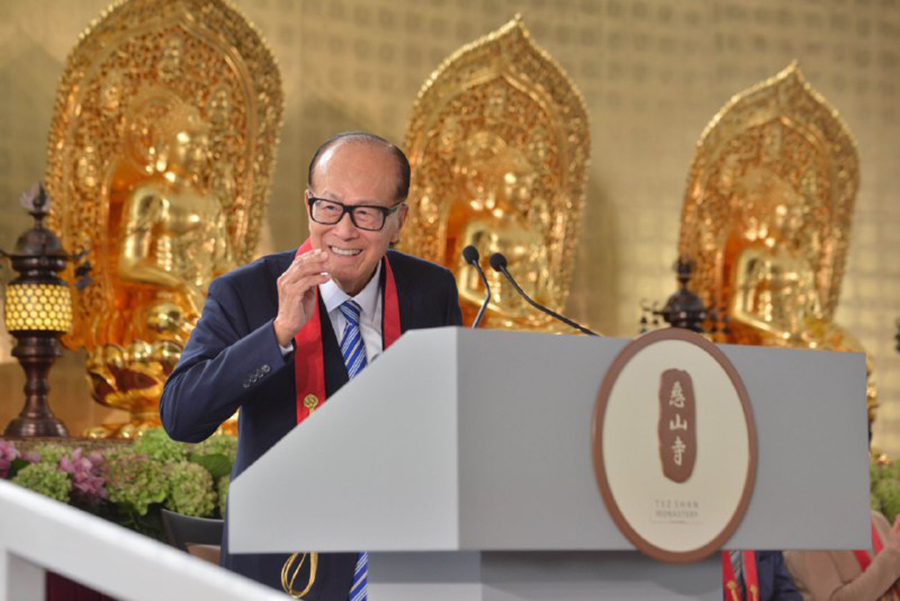 由李嘉誠基金會斥資逾30億興建的慈山寺,昨舉行開光儀式。基金會主席李嘉誠以及兩子均有出席,李嘉誠希望慈山寺能為反思和探求的心提供空間,並以「八正道」寓意香港精神。