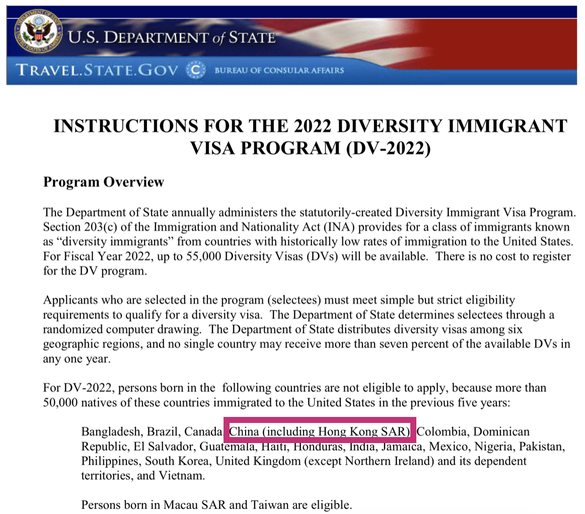 中共當局在香港實施「港版國安法」,毀壞香港「一國兩制」,美國早前宣佈取消香港特殊待遇。7日,美國國務院領事事務局公佈,美國新一年度抽籤移民簽證(DV)計劃於10月7日開始接受申請,但此次符合資格申請的地區中並不包括香港。