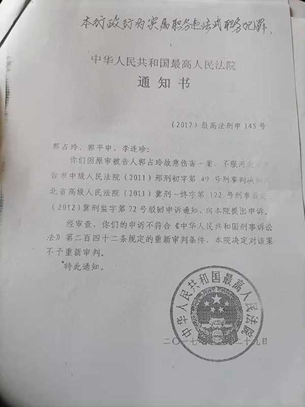 2016年12月1日最高法院向河北省高院發出調卷函,調卷審查曾讓李連珍看到一絲轉機。但是2017最高法的通知書顯示,經審查,他們的申訴不符合重新審判條件,決定不予重新審判通知。律師認為,本行政行為實屬職務違法或職務犯罪。