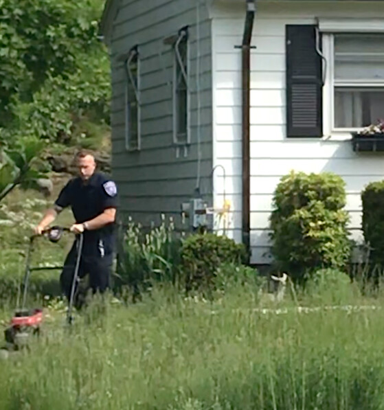 司機帶著割草機回來了,警官開始除草。「我只是覺得如果她需要某種幫忙,那為甚麼不幫她一把呢?」他說。