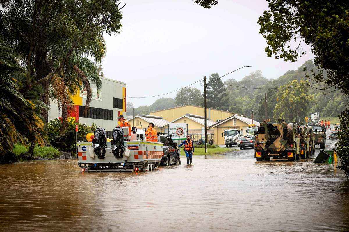 圖片顯示,3月29日至30日,利斯莫爾許多街道遭洪水淹沒,車輛受困其中,陸軍士兵與州緊急事務處(State Emergency Service,簡稱SES)一起執行疏散居民的任務。拜倫灣(Byron Bay)許多居民在街上涉水通行。#