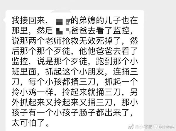 有知情者在網上發帖表示,有兩個老師搶救無效死掉了。看了監控,那個歹徒跑到那個小班裏面,抓起這個小朋友,連捅三刀,每個小孩都捅三刀,太可怕了。
