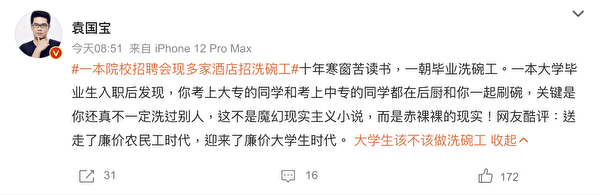 網民「袁國寶」:十年寒窗苦讀書,一朝畢業洗碗工。一本大學畢業入職後發現,你考上大專的同學和考上中專的同學都在後廚和你一起涮碗,關鍵是你還真不一定洗得過別人,這不是魔幻現實主義小說,而是赤裸裸的現實!網民酷評:送走了廉價農民工時代,迎來了廉價大學生時代。