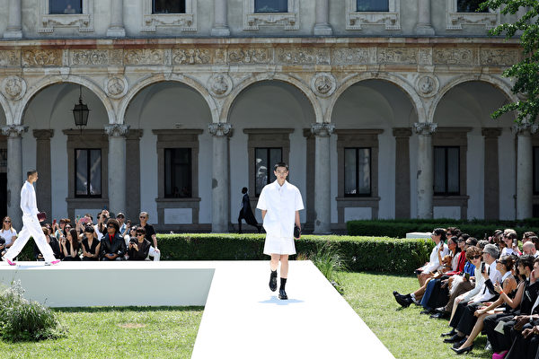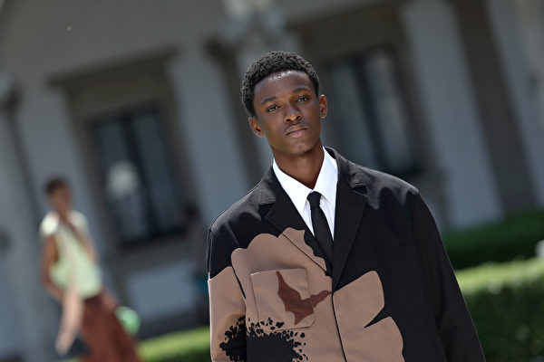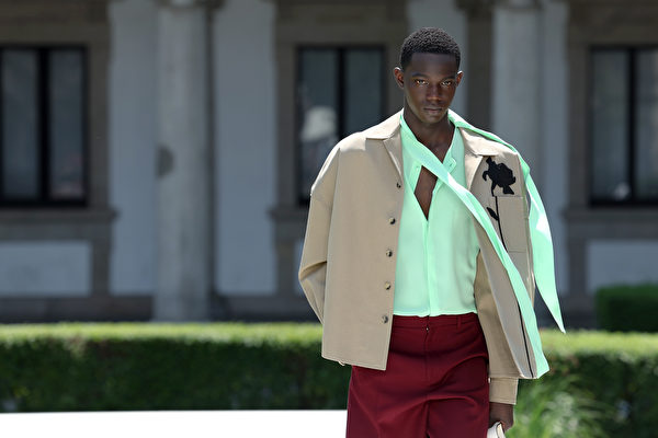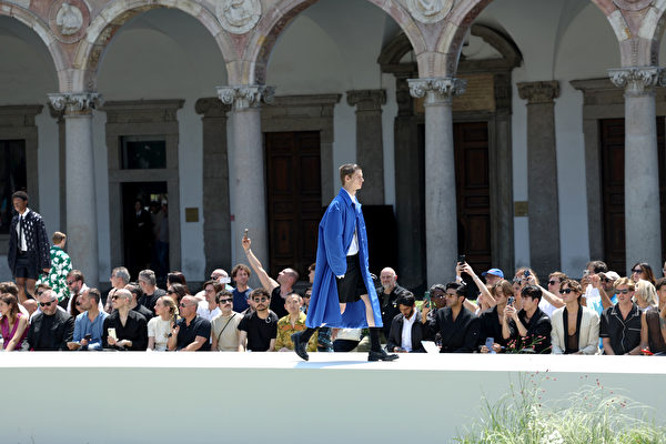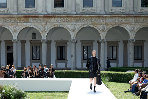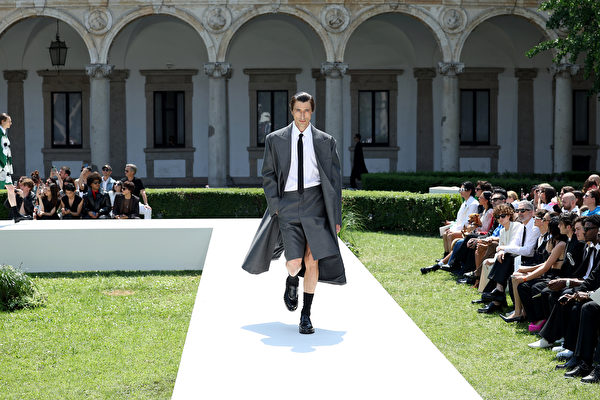 2023年6月16日在意大利米蘭舉行2024年春夏米蘭時裝周,在男裝春夏服裝展示期間,一名模特走在Valentino 2024春夏時裝表演的伸展台上。(Vittorio Zunino Celotto/Getty Images)