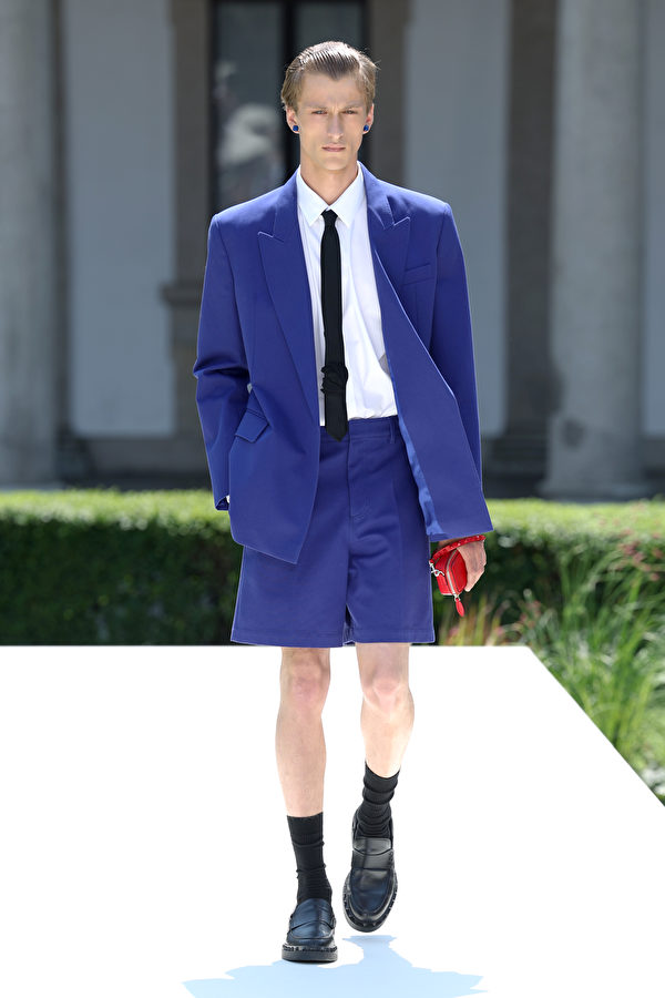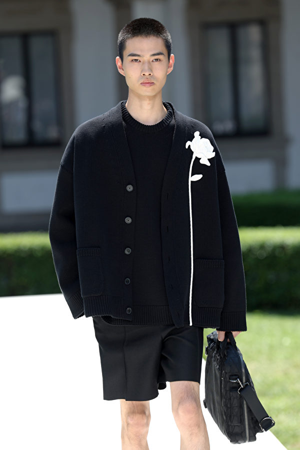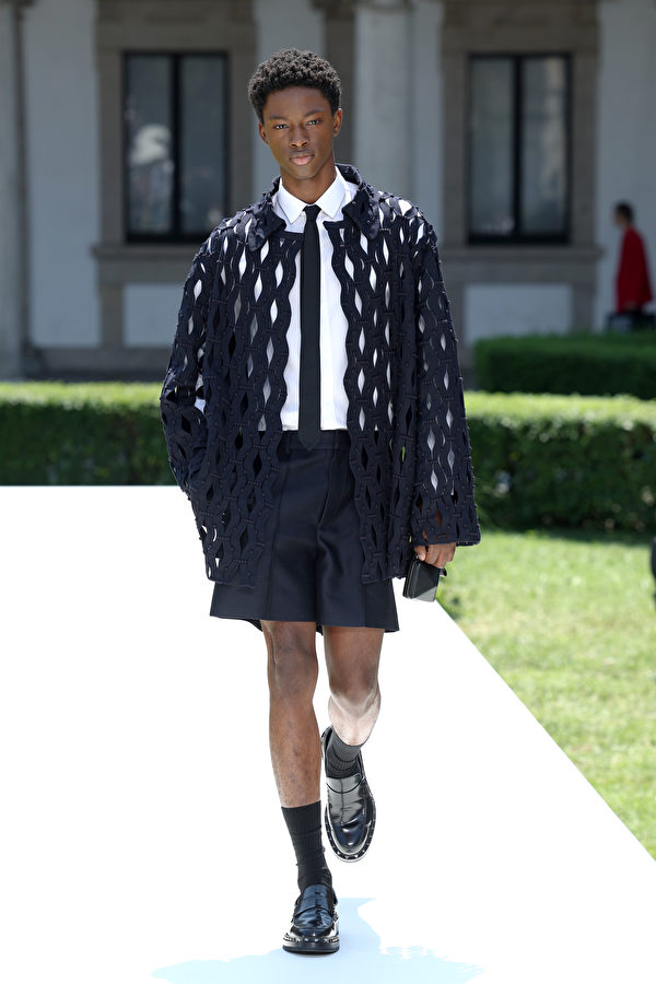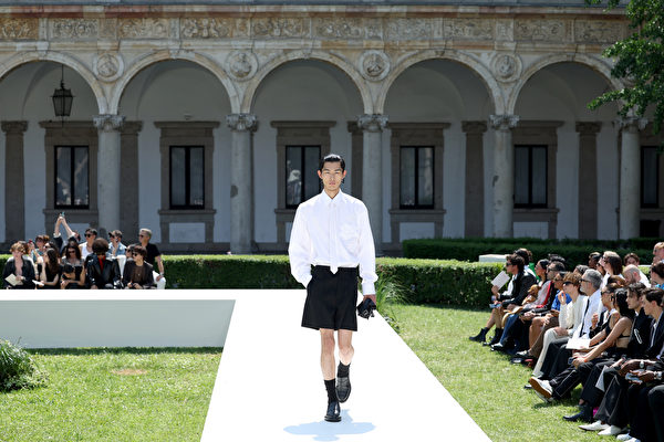 2023年6月16日,意大利米蘭舉行2024年春夏米蘭時裝周,在男裝春夏服裝展示期間,一名模特走在Valentino 2024春夏時裝表演的伸展台上。(Vittorio Zunino Celotto/Getty Images)