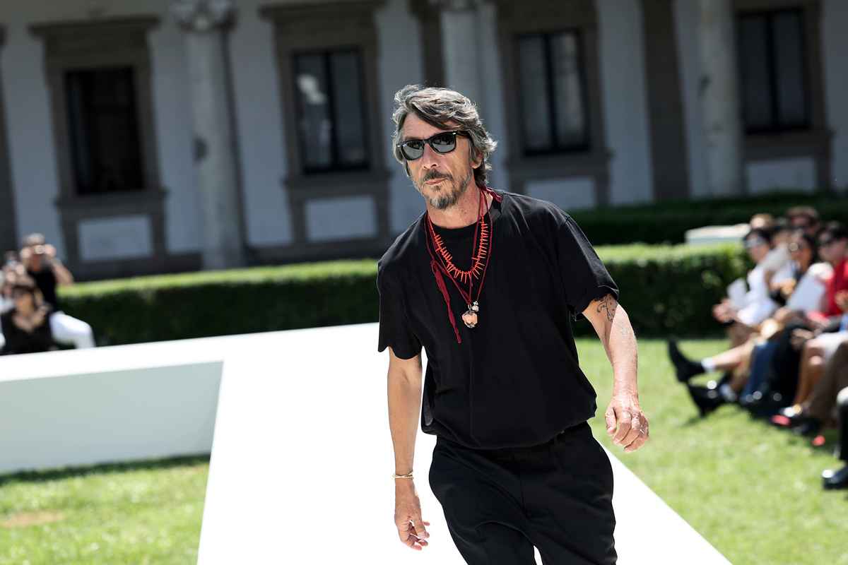 2023年6月16日,華倫天奴時裝設計師、創意總監Pierpaolo Piccioli走在意大利米蘭舉行的2024年春夏男裝米蘭時裝周的伸展台上,他在Valentino 2024春夏時裝表演上感謝觀眾的掌聲。(Vittorio Zunino Celotto/Getty Images)