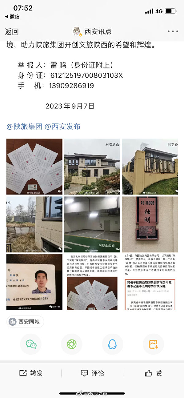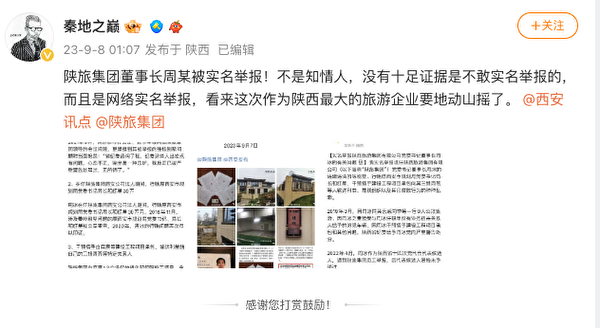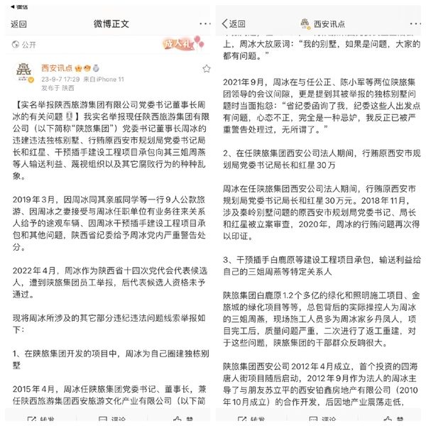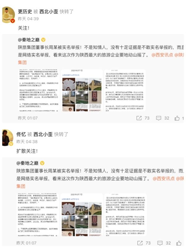 9月9日,上游新聞陝西頻道主任、微博大V秦地之巔附圖並發博文說:「陝旅集團董事長周某被實名舉報!不是知情人,沒有十足證據是不敢實名舉報的,而且是網絡實名舉報,看來這次作為陝西最大的旅遊企業要地動山搖了。」