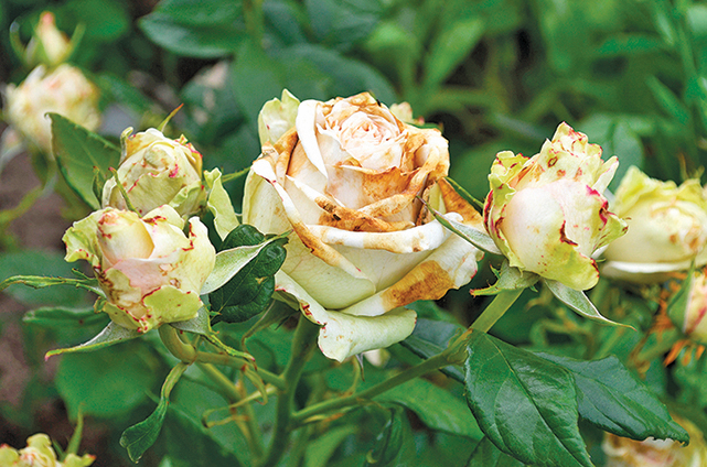 或者像是被撒了麵粉一樣長出白色黴菌,漸漸地整片葉子都會被黴菌覆蓋,導致新芽發不出來,生長情況也跟著惡化。如果出現這些情況,要趁早切除發病的位置,並連同落葉清掃乾淨。同時要避免密植,並且定期修剪過於茂密的枝葉,以保持良好的通風與日照。特別注意的是,不要添加過量的氮肥。