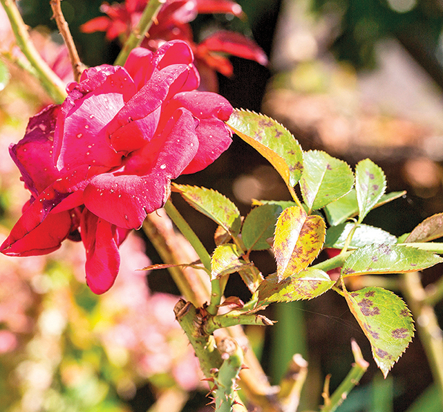 玫瑰病蟲害算很多,常見的葉斑病會長出有如浸水般的淡褐色和黑紫色病斑,之後逐漸擴大、轉為黃色,然後落葉。病情擴散時,連莖都會枯萎。