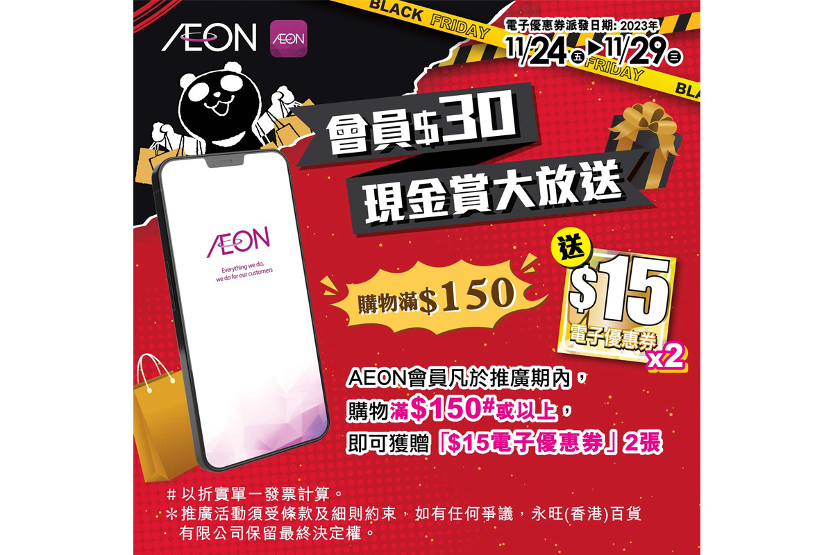 凡於推廣期內購物滿150元或以上,AEON會員即可獲贈「$15電子優惠券」2張,AEON 會員於AEON、AEON STYLE及AEON SUPERMARKET購物滿$150或以上時,即可使用優惠券1張。