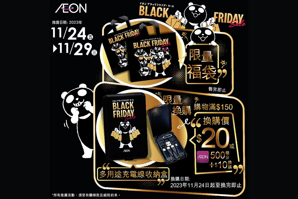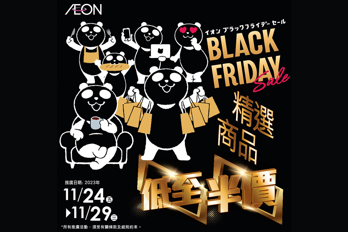AEON宣布推出黑色星期五優惠,今個周五(24日)至下周三(29日),將推出多款低至3折的超值限量「AEON Black Friday」福袋,精選商品亦以低至半價發售,貨品涵蓋食品、煮食用具、行山裝備、運動用品、床品、美妝用品等,更有「限時放題」、「限量換購」、「AEON會員$30現金賞大放送」等活動。