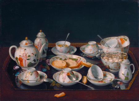 洛杉磯蓋蒂中心收藏的這幅《靜物:茶具》展示了昂貴的中國瓷器和銀湯匙。畫家或曾將畫作擺放在工作室,以向客戶展示他的優雅風格以及描繪體積、質感和光影的功力。畫中有個托盤,上面擺放著茶壺、糖碗、牛奶壺、有蓋的花瓶,以及六套杯碟。