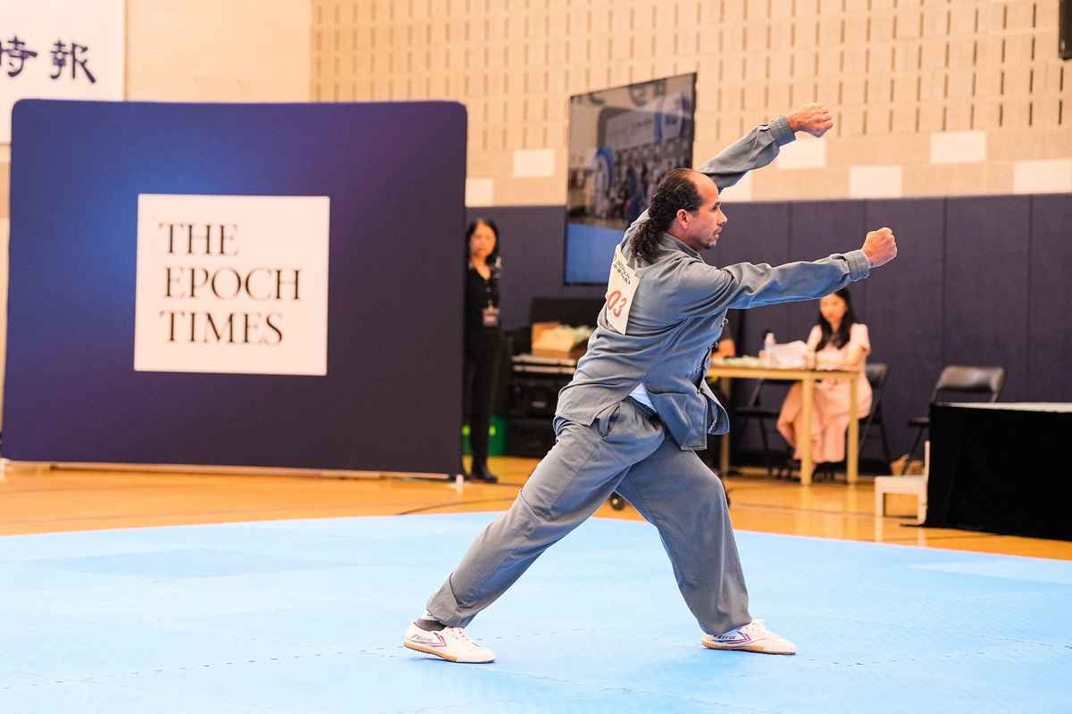 2024年8月31日下午,在美國新澤西州沃爾德威克(Waldwick),第八屆新唐人全世界中華傳統武術大賽舉行初賽。圖為美國選手馬里奧·薩拉查(Mario Salazar)在男子拳術組比賽中表演螳螂拳之白猴偷桃。(戴兵/大紀元)