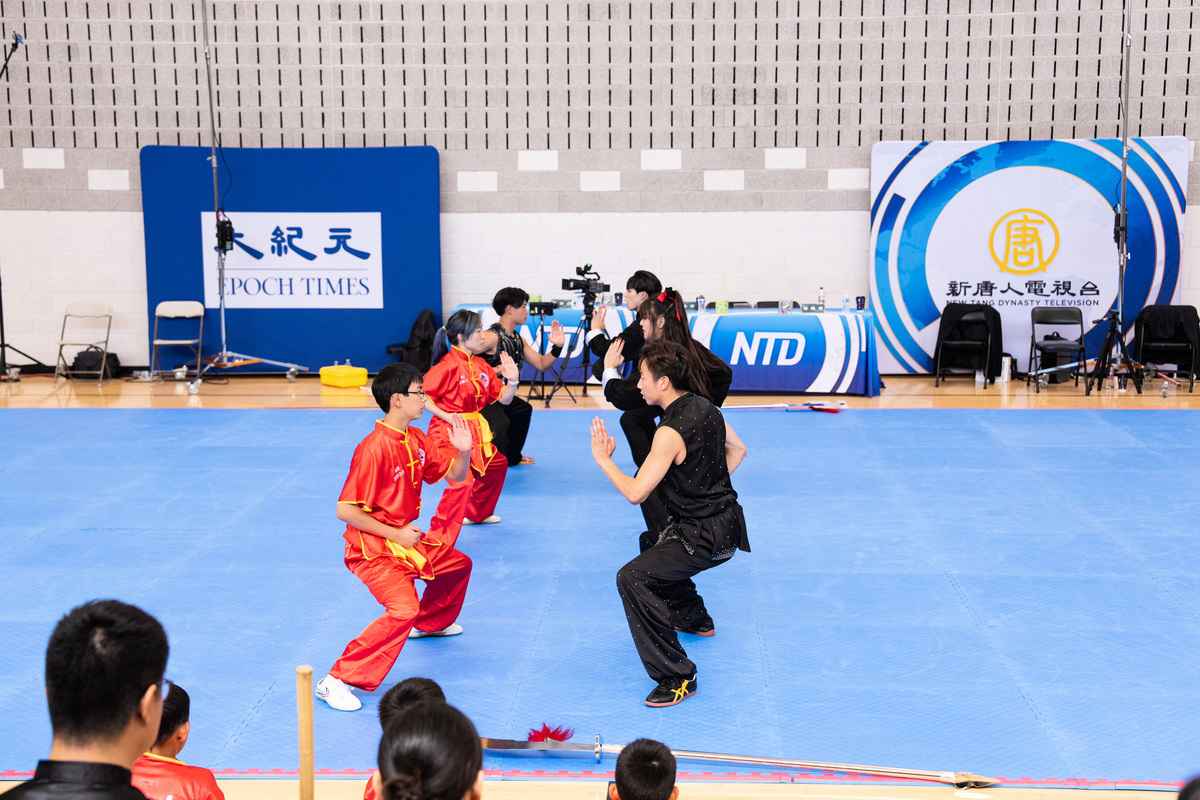2024年9月2日下午,新澤西州沃爾德威克(Waldwick),第八屆新唐人全世界中華傳統武術大賽在比賽結束後,進行了一場精彩紛呈的武術展演。圖為秀山武術社高雨虹、梁軒綸、楊恩碩與楊恩睿展示螳螂手團練。(戴兵/大紀元)