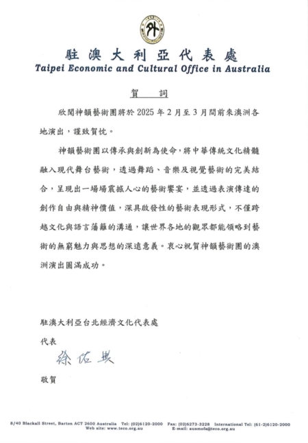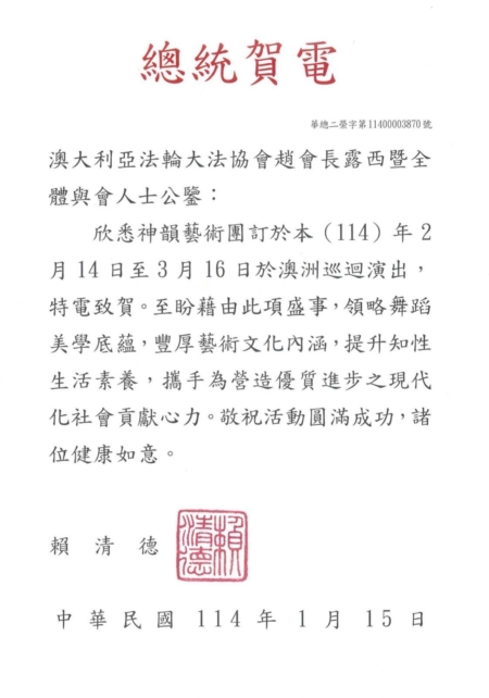 賴清德總統在賀電中說:「欣悉神韻藝術團訂於本(114)年2月14日至3月16日於澳洲巡迴演出,特電致賀。至盼藉由此項盛事,領略舞蹈美學底蘊,豐厚藝術文化內涵,提升知性生活素養,攜手為營造優質進步之現代化社會貢獻心力。」