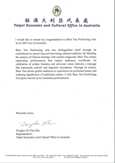 台灣,不僅承襲了中華神傳文化的深厚底蘊,更致力於弘揚傳統價值觀。適逢神韻藝術團訪問澳洲,駐澳洲台北經濟文化代表處代表徐佑典先生亦特致賀辭。