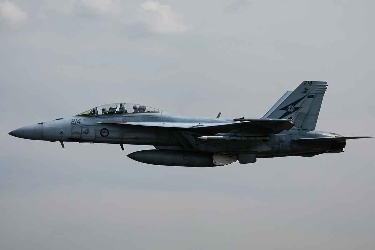 2025年3月28日,墨爾本阿瓦隆機場,澳洲國際航空展向公眾開放首日,一架澳洲皇家空軍(RAAF)的F/A-18F超級大黃蜂戰機做飛行表演。(Paul Crock/AFP via Getty Images)