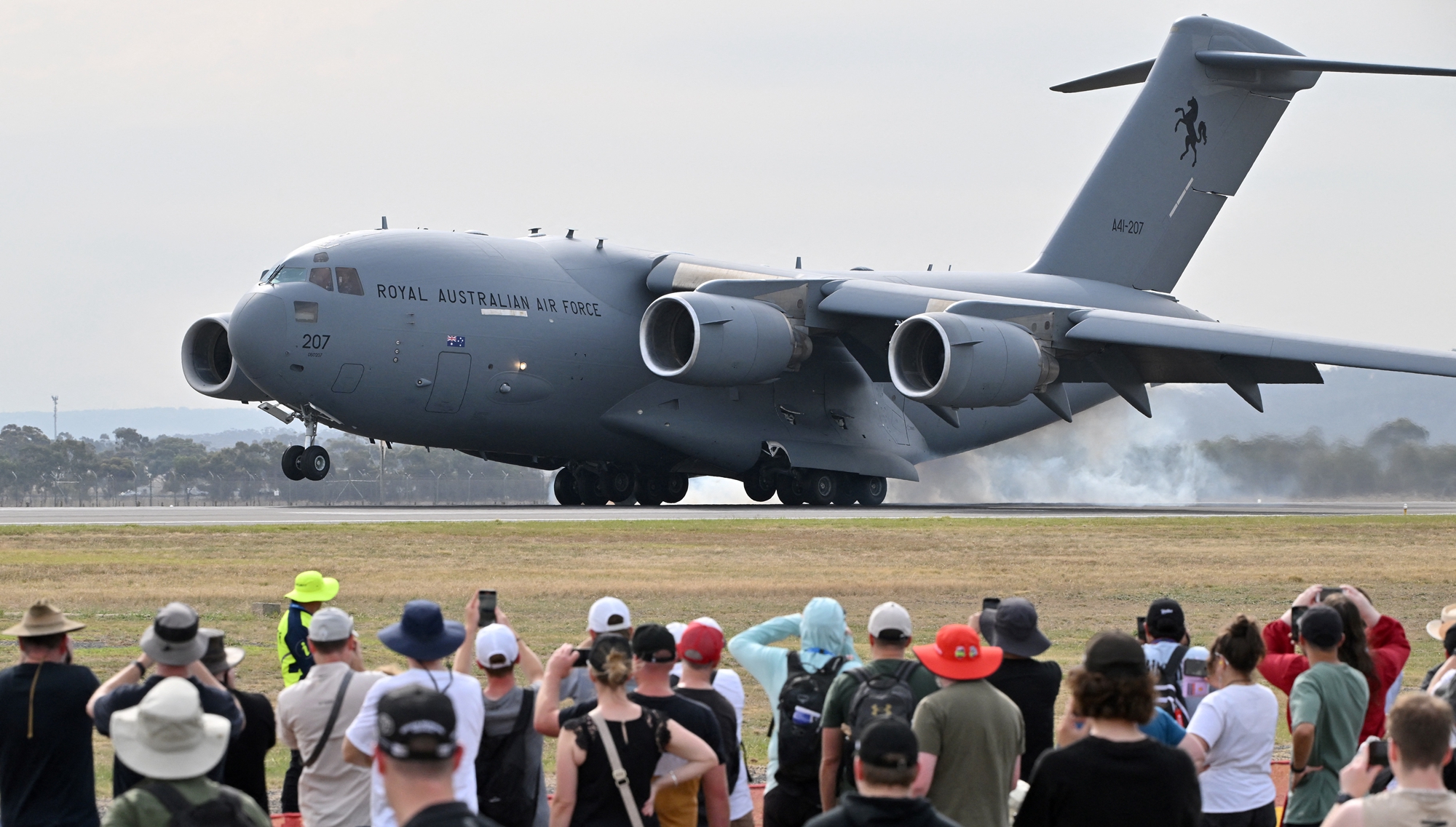 2025年3月28日,墨爾本阿瓦隆機場,澳洲國際航空展向公眾開放首日,一架澳洲皇家空軍 (RAAF) 的C-17環球霸王運輸機準備起飛,隨後進行飛行展示。(Paul Crock/AFP via Getty Images)