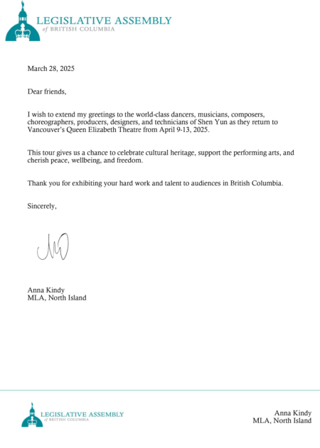 卑詩North Island省議員Anna Kindy在賀信中表示,「值此神韻世界級舞蹈家、音樂家、作曲家、編舞、製作人、設計師和技術員於2025年4月9日至13日重返溫哥華伊利沙伯女王劇院演出之際,我謹向你們表達我的問候。