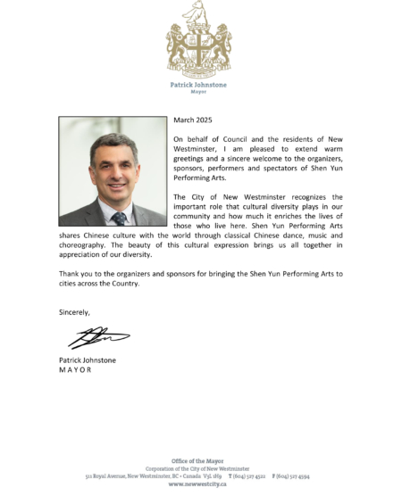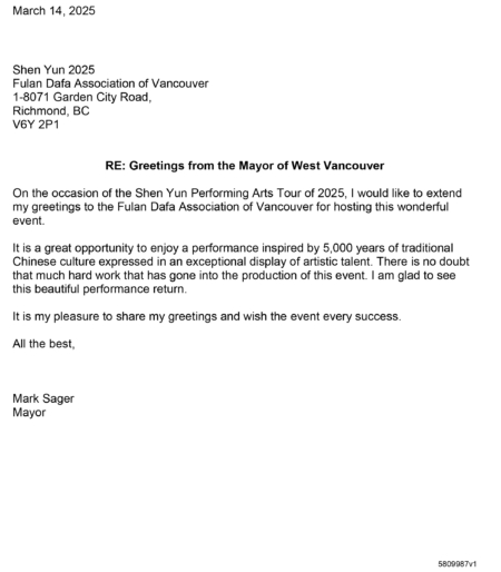 神韻藝術團再度蒞臨溫哥華,西溫哥華(West Vancouver)市長Mark Sager在賀信中表示,「這是欣賞神韻的極好契機,她以卓越的藝術才華,將五千年的中華傳統文化演繹得淋漓盡致。毫無疑問,這一鉅作傾注了大量心血。我很高興看到這場美麗的演出再次回歸。」