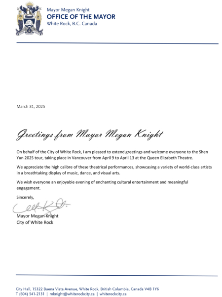 白石鎮(White Rock)市長Megan Knight在賀信中說:「我們讚美這高水準的演出,她(神韻)以令人歎為觀止的音樂、舞蹈和視覺藝術,展現眾多世界級藝術家的才華。
