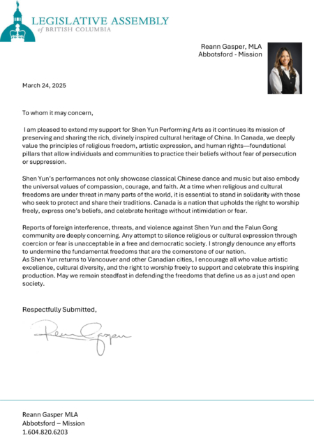 卑詩省Abbotsford – Mission選區省議員Reann Gasper在賀信中說,「我很高興支持神韻藝術團,因為她堅持不懈地履行使命:保護並分享中國神傳的豐富傳統文化。