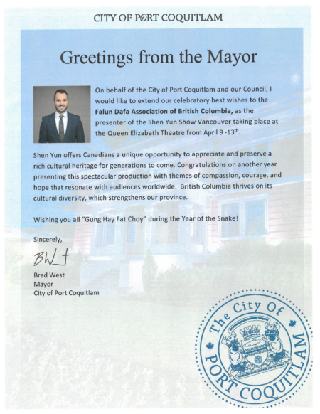 高貴林港(City of Port Coquitlam)市長Brad West代表高貴林港市及市議會,向神韻演出主辦方卑詩省法輪大法協會「致以最美好的祝賀」。