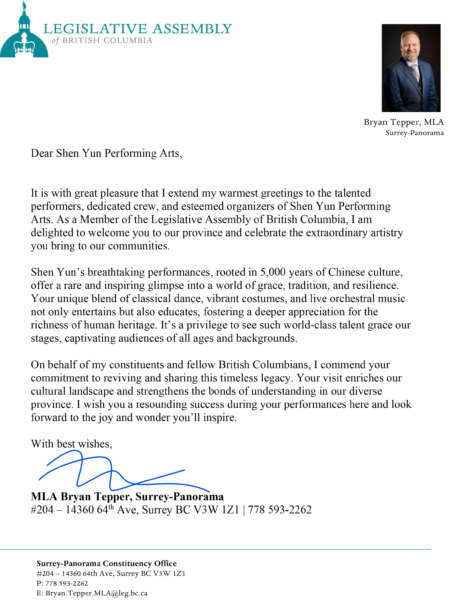 卑詩省Surrey-Panorama選區省議員Bryan Tepper在賀信中說:「我懷著無比喜悅的心情向神韻藝術團才華橫溢的藝術家、敬業的工作人員及組織者致以最熱烈的問候。作為卑詩省議員,我衷心歡迎你們來到我們省,並為你們把卓越的藝術帶給我們的社區而喝采。