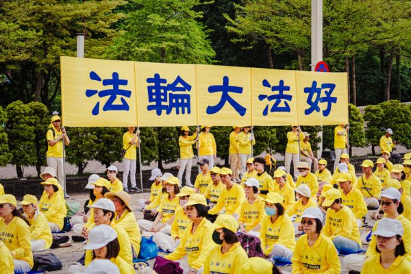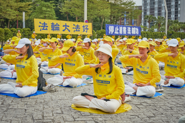 2025年4月19日,「紀念中國大陸法輪功學員4‧25和平上訪26周年」集會活動在台北市政府前舉辦。(林家弘/大紀元)
