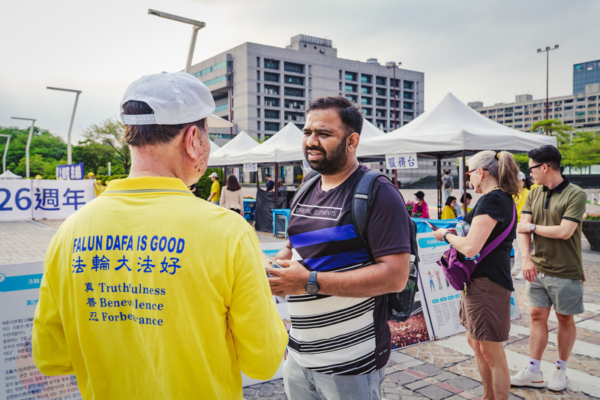 2025年4月19日,「紀念中國大陸法輪功學員4‧25和平上訪26周年」集會活動在台北市政府前舉辦,西人停留了解真相。(趙郁誠/大紀元)