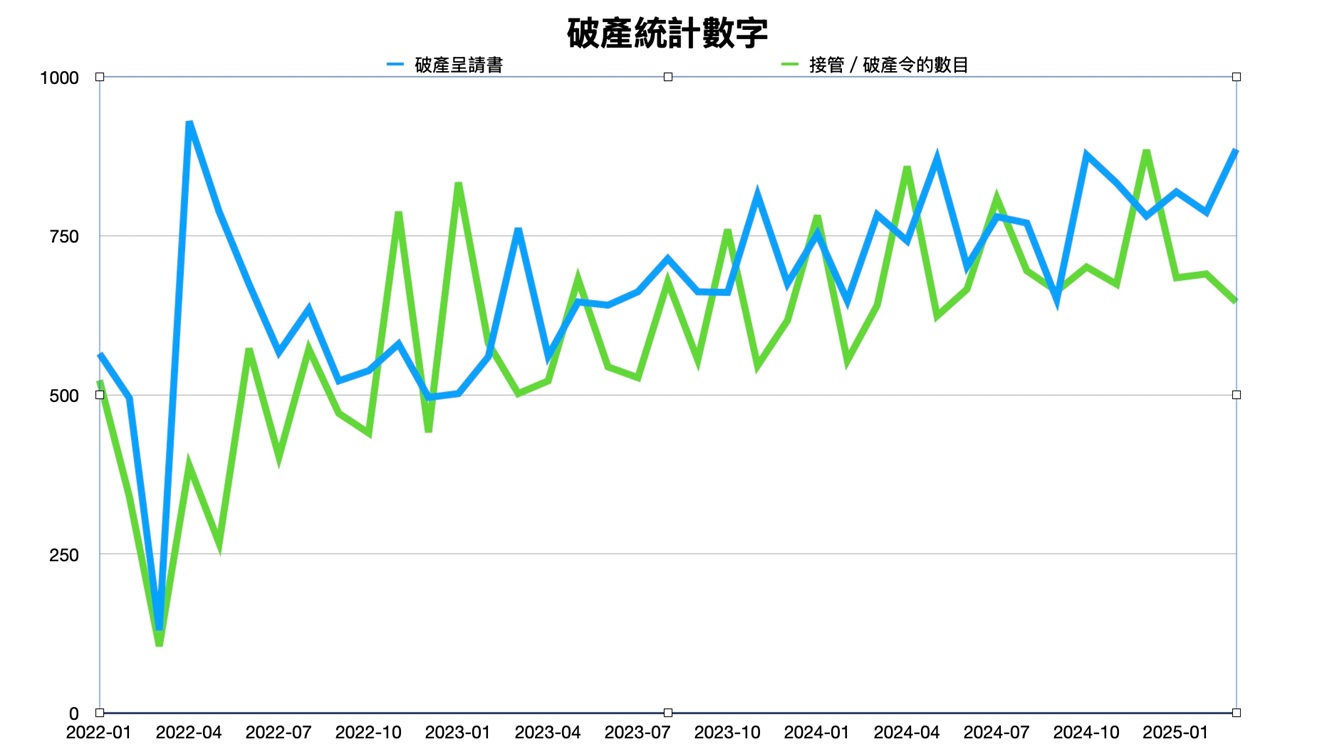 先談破產宗數。根據最新的破產管理處數據,個人破產宗數在2025年3月上升至886宗,創下自2022年4月以來的3年新高。從圖表上可以看出,自去年第三季9月起,破產宗數的狀況便開始上升,並且逐步加速。目前,破產申請宗數平均每月超過800宗,甚至本月接近900宗,這是3年來的最高數字。