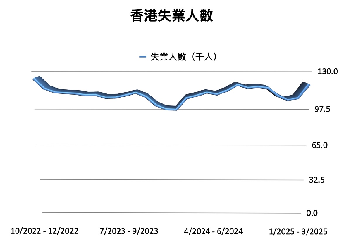 所以在這個背景下,由於總勞動人口的回升,使失業率得以維持低位。高才通政策在這方面也起了重要作用。根據政府數字,已經有九萬人申請高才通計劃並獲批,勞福局估算有八萬人已經到達香港,這填補了香港在過去幾年流失的勞動人口。然而,失業人口數據卻在惡化。截至 2025 年 3 月,我們的失業人口已經飆升至 12萬人,單月失業人數增加了一萬。這是一個相當嚴重的問題,失業人口已是兩年來的新高。上一次失業人口達到這樣的水平是在 2022 年 12 月,當時香港的疫情和封關措施導致經濟萎縮。如今即使政府宣稱香港經濟復常,但失業人數顯示問題卻有加劇的趨勢,這也能反映周圍人的感受。