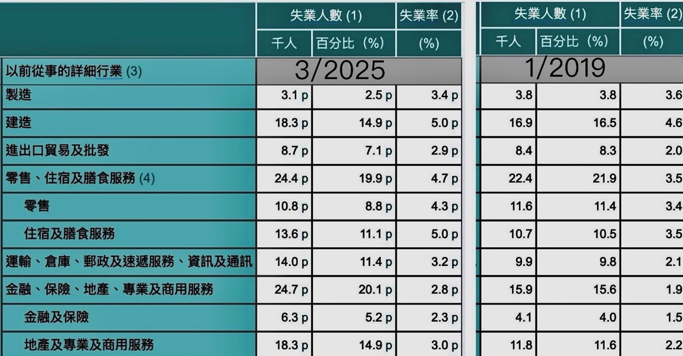 值得比較是2019 年 1 月時經濟仍是蓬勃發展的狀態,而 2025 年 3 月的不同行業的失業情況卻大相逕庭。舉例來說,建築業的失業人數已從16,900人上升至18,300人,失業率也達到 5%,成為主要行業中最高的。零售業的住宿和膳食服務也從約一萬人的失業人數上升至13,600人,還有其它如地產及專業商用服務等行業的失業人數也在上升。