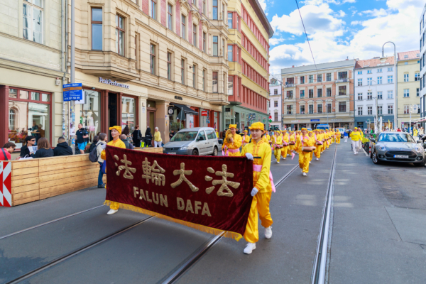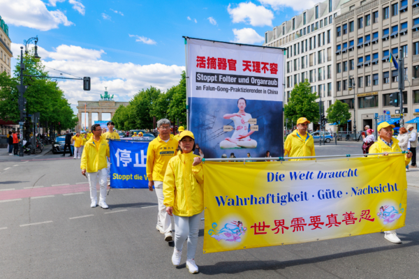 當天風和日麗,在陽光的照耀下,法輪功學員的黃色、藍色服裝分外亮麗。中午時分,遊行隊伍的不同方陣,例如天國樂團、腰鼓隊、功法展示、旗幟隊、舞龍隊等在勃蘭登堡門前整齊列隊,中西方學員都用中文齊聲念誦:「恭祝師父生日快樂,『法輪大法好』,『真、善、忍好』,謝謝師父!」