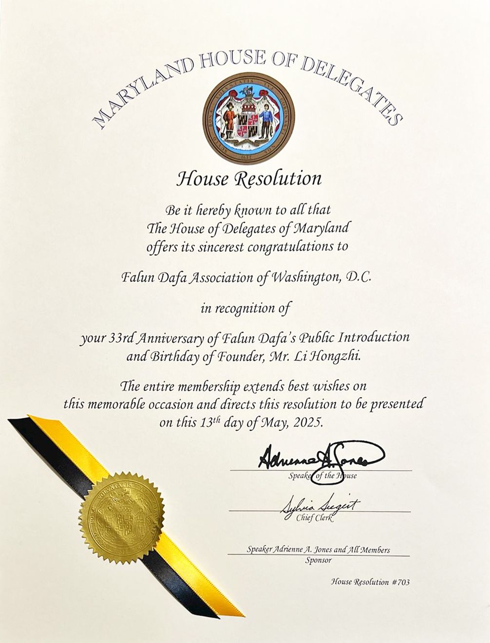 馬利蘭州眾議院通過了第703號決議案,該決議案寫道:「馬利蘭州眾議院所有成員向華盛頓DC法輪大法學會致以最誠摯的祝賀,祝賀法輪大法洪傳33周年,祝賀法輪大法創始人李洪志先生華誕。」