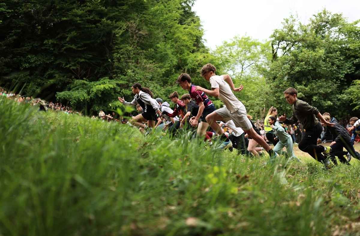 2025年5月26日,英國布羅克沃思村(Brockworth)舉辦一年一度的滾芝士大賽。圖為男子組選手正在參賽。(Cameron Smith/Getty Images)