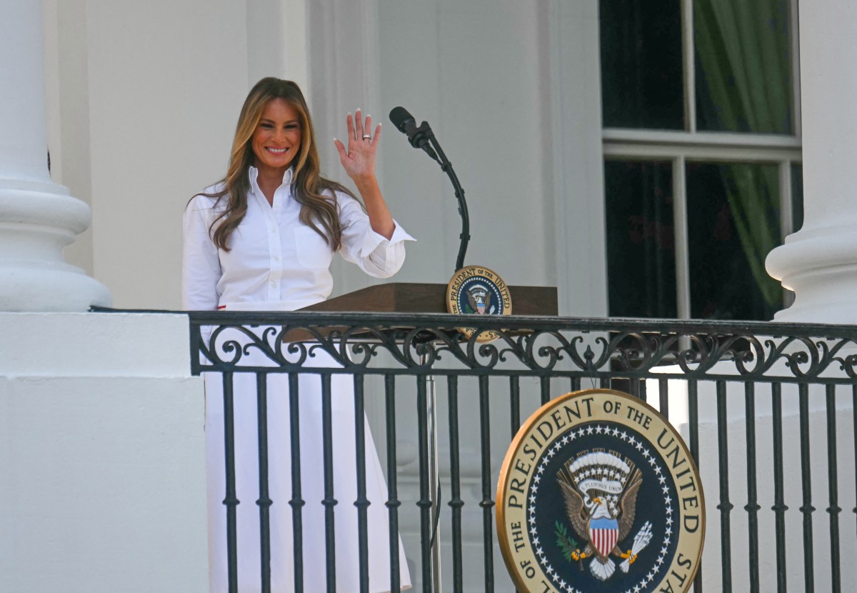 夏季到來之際,梅拉尼婭選擇簡約著裝,參加獨立日相關活動。周五下午,她身著白色襯衫裙裝(shirt dress),出現在白宮藍廳的陽台上,向南草坪參加2025年現役軍人野餐會的人群揮手致意。