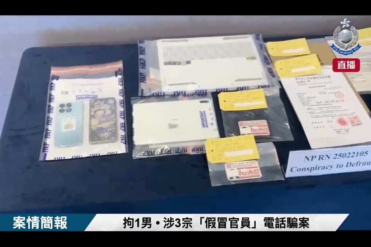 警方展示搜獲的證物,包括偽造廉署證件及大陸執法部門文件,以及兩部手提電話。