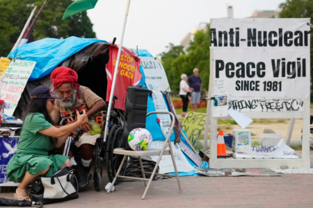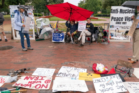 這頂藍帳篷是一場始於1981年的反核武器抗議,由提倡者威廉·托馬斯(William Thomas)在拉斐特廣場(Lafayette Square)發起,至今持續44年。帳篷內經常播放多國國歌,其中包括中共國歌。