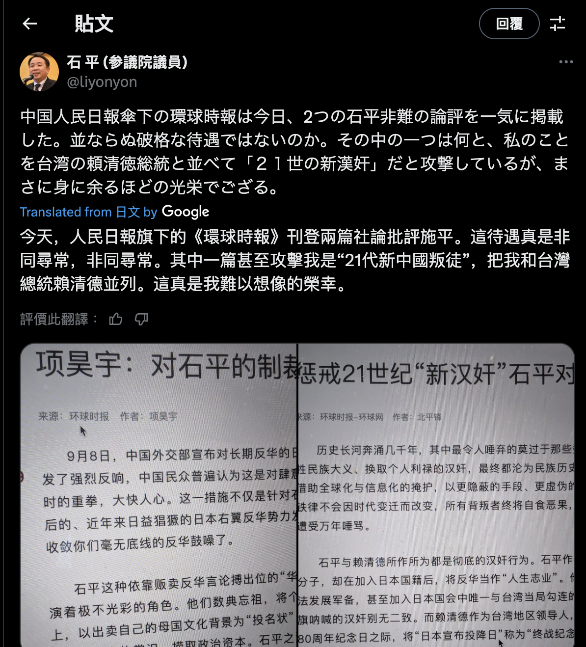 在石平受到制裁後,中國網絡上出現許多批評石平的文章。9月9日,中共《環球時報》連發評論文章批石平。石平在X上回應,「今天,《人民日報》旗下的《環球時報》刊登兩篇社論批評石平。這待遇真是非同尋常、非同尋常。其中一篇甚至攻擊我是『21世紀新漢奸』,把我和台灣總統賴清德並列。這真是我難以想像的榮幸。」