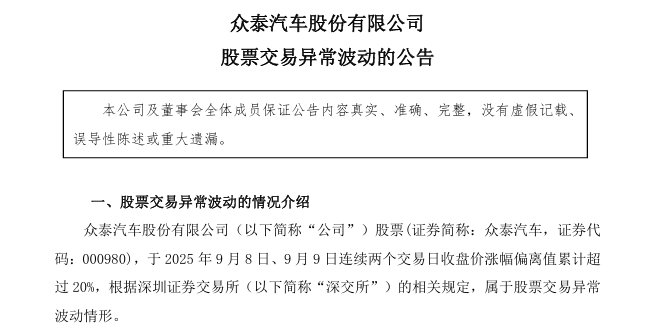 眾泰汽車在9日晚發布的《股票交易異常波動的公告》中表示,公司股票在2025年9月8日、9月9日連續兩個交易日收盤價升幅偏離值累計超過20%,「根據深圳證券交易所的相關規定,屬於股票交易異常波動情形」。