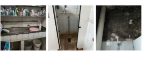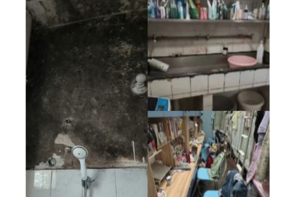 多名學生在微博曝光的照片顯示,研究生宿舍內從書桌到上下鋪的距離大概僅夠一名成年人通過,十分狹窄;學生共用的廁所骯髒得讓人作嘔,浴室牆體更是發霉到已經變黑。