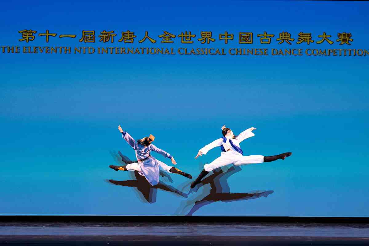 2025年9月12日,第十一屆新唐人全世界中國古典舞大賽青年男子組初賽在美國紐約州Sugar Loaf表演藝術中心舉行。圖為青年男子組參賽選手郭新宇(右)表演舞蹈《七步 • 留情》。(戴兵/大紀元)