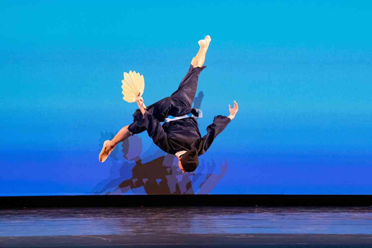 2025年9月12日,第十一屆新唐人全世界中國古典舞大賽青年男子組初賽在美國紐約州Sugar Loaf表演藝術中心舉行。圖為青年男子組參賽選手李如初表演舞蹈《他鄉扇》。(戴兵/大紀元)