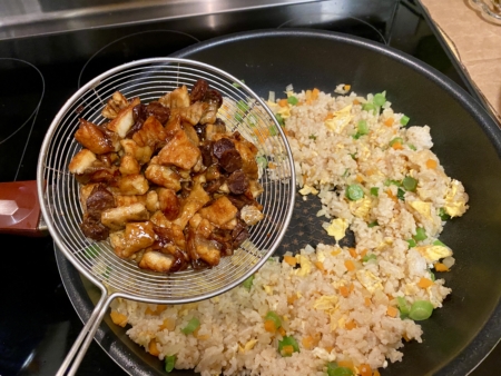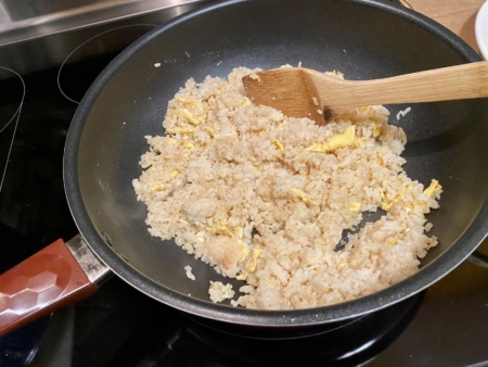 5. 再下少許油,放入蛋液炒至半熟,再加入白飯,翻炒均勻至金黃色。