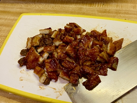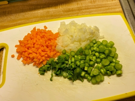 1. 洋蔥、紅蘿蔔和油菜梗切成小粒備用。