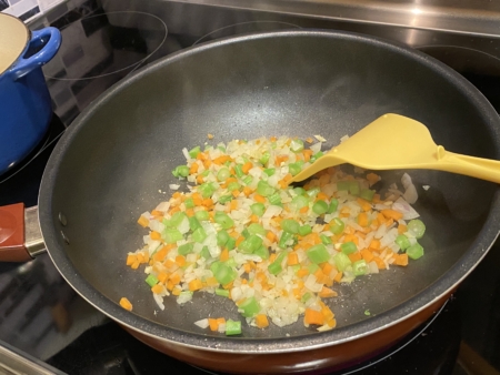 4. 熱鍋下油,先把蔬菜粒炒香盛出備用。