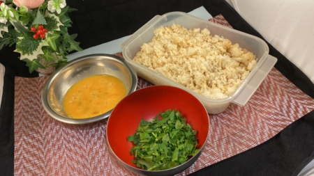 3. 雞蛋打散。白飯可以用新鮮白飯來做,或用冷飯,放入微波爐加熱2分鐘。
