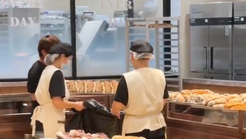 有網民發布一段影片,9月13日晚,上海萬象城裏一家網紅麵包店,在營業結束後,店員直接將一筐筐沒有賣完的麵包,扔進了黑色的大垃圾袋裏,場面令人震驚。
